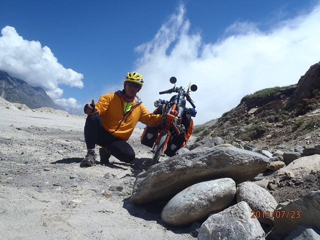 Today,s ride is just as tough as yesterday.From the foothill of one side where we camped, all the way climbed 20 km to the top of Rohtang Pass , and then came the downhill of some rocky and muddy road to the other side of the foothill in Koksar where we stayed at the only basic guesthouse Rs 200. We started early at 5.40am and had our breakfast at Marhi after 3 km , the climb continues like no ending at 3-5 kmh ,along the way, Nepalese workers were seen ferry by the truck to repair the bad portion of the road, they used very traditional tool like hammer to break up the rock into small pieces of stones to fill up the muddy or uneven stretch.They are very friendly and always like to wave me down to take pictures,maybe this is the 1st time they have seen such a strange bike with fully loaded panniers on this road. There is one particular stretch extremely muddy and riding is near impossible, the condition of the mud is just like a mixed cement, even pushing the bike thru' needed a lot of strength, my bike uses V-brake,so lots of mud got stuck in between,but fortunately,there are stream that allow us to wash them clean,so as not to add more damage to our rims and brake pads.We also started to see some ice glaciers when the altitude reaches 3500 m, where extra clothing was added . So far i did not face the AMS symptom, but was feeling very hungry as there is nothing up here . When we finally reached the top, there is nothing up there except with a small cemented hut decorated by some hanging Tibetan flags. If the uphill road is bad , the downhill is worse with most of the tarmac being washed away and replaced with uneven rocks, I had to really 100% concentration with all the sharp bends with no side protection at all, one silly mistake, you find yourself down into the deep valley,and chances are as good as your everlasting burial ground. Chee initially was rather over-ambitious wanted to go until Sissu which is another 12 km from Koksar ,but gave up the idea . We both agreed that will be for tomorrow until Keylong, 46 km from Koksar.